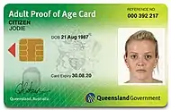 ![]() The front of a Queensland Adult proof of age card | |