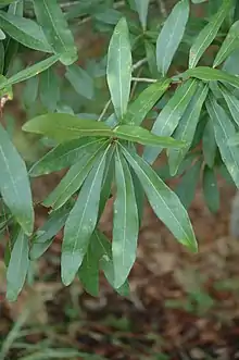 The botanist C.J. Burke[4][5] suggested that swamp laurel oak is of hybrid origin having been derived from willow oak (Quercus phellos) and water oak (Quercus nigra); it is not found outside the ranges of the two supposed parental species. This conclusion was based on an index from leaf-shape on seedlings grown from acorns. However, this theory has not achieved wide support, with current authors accepting Quercus laurifolia as a distinct species (e.g. Flora of North America).[3]
