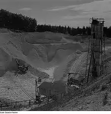 Production continued after 1945 with pre-war technology. In order to increase the flow rate and at the same time to guarantee a consistent quality of the chalk with a residual moisture of about 0.5% and grain sizes not above 63 microns, new technologies were developed and a new chalk plant constructed in Klementelvitz[12] after 1958 for 30 million Mark (DDR).[13] In this context, the heavy physical work in the mine face was completely replaced by modern conveyors such as the excavator UB 80, a GDR standard excavator of the 1960s and 1970s. Both the raw chalk and the debris were transported by railways. With the completion of this plant in 1962 (initially trial operation, from 1963 regular production) the production time from excavation to shipping was reduced to only 80 minutes. Until then, it was up to 80 days.