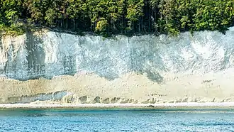 Rügen chalk (German: Rügener Kreide or Rügener Schreibkreide) is the common name for a very pure, very fine-grained, white, crumbly and highly porous chalk that forms the highest member of the German Upper Cretaceous, and is of Maastrichtian age. It is found exposed in cliffs on the coast of the Jasmund peninsula in the northeast of the island of Rügen in Mecklenburg-Vorpommern.