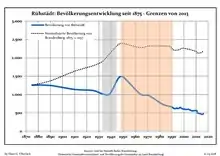 Development of Population since 1875 within the Current Boundaries (Blue Line: Population; Dotted Line: Comparison to Population Development of Brandenburg state; Grey Background: Time of Nazi rule; Red Background: Time of Communist rule)