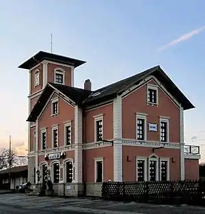 The former entrance building is built of brick with elements of the Neoclassical and Romanesque Revival styles. The heritage-listed building also has a three-storey tower.[5] It is no longer used for railway operations. In the 1980s, it was renovated by a local association and part of it is used as a restaurant. The former freight shed also still exists and was restored in the 2000s.