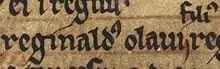 ![]() Rǫgnvaldr Óláfsson's name as it appears on folio 47r of British Library Cotton Julius A VII (the Chronicle of Mann): "Reginaldus Olavi filius".[2] | |