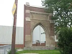 ![]() The main archway to the school, one of the original components of the 1922 building, shown in the center (top) Modern school building, partially built in 1975 on the western parking lot (bottom) | |