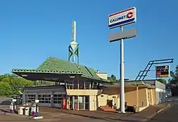 The R. W. Lindholm Service Station is a service station designed by Frank Lloyd Wright and located in Cloquet, Minnesota, United States. Built in 1958 and still in use, it is the only station built to a Wright design during his lifetime. It was originally part of Wright's utopian Broadacre City plan and is one of the few designs from that plan that was actually implemented. The building is listed on the National Register of Historic Places.