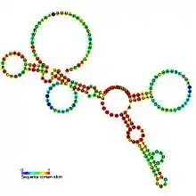 Within this 5' protein binding site an RNA pseudoknot structure occurs.[6] The pseudoknot is highly conserved between the 5 silk moth species. Sequence comparisons show evidence for compensatory mutations within the helical regions indicating the secondary structure of the RNA is of biological importance. In particular, this pseudoknot is proposed to have implications for initiation of translation.[7]
