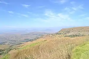 Overview over the Tugela basin from the Oliviershoek Pass. The R74 can be seen on the right