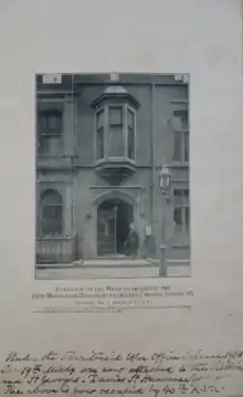 The building was designed by Samuel Knight as the headquarters of the St Giles's and St George's Bloomsbury Rifles and completed in 1882.[3] It has a notable artistic history: in the 1900s, Sergei Diaghilev and the Ballets Russes rehearsed there.[3] The Bloomsbury Rifles amalgamated with the 1st Middlesex (Victoria and St George’s) Volunteer Rifle Corps and moved out to the Davies Street drill hall in 1908.[4] In their place the 12th (County of London) Battalion, London Regiment (The Rangers) took over the Drill Hall in Chenies Street on 25 June 1908.[4] The battalion was mobilised at the Drill Hall in August 1914 before being deployed to the Western Front.[5]