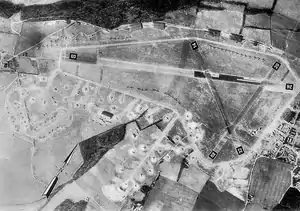 ![]() Ramsbury airfield photographed in May 1944 with west oriented upwards. Taken about a month before D-Day with the airfield full of C-47s and Horsa gliders of the 437th Troop Carrier Group. | |