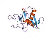 Pancreatic Stone Protein (PSP), also known as Lithostathine-1-alpha islet cells regeneration factor (ICRF) or islet of Langerhans regenerating protein (REG) is a protein that in humans is encoded by the REG1A gene as a single polypeptide of 144 amino acids further cleaved by trypsin to produced a 133 amino acid protein that is O-linked glycosylated on threonine 27. This protein is a type I subclass member of the Regenerating protein family. The Reg protein family is a multi protein family grouped into four subclasses, types I, II, III and IV based on the primary structures of the proteins.[4][5][6] Reg family members REG1B, REGL, PAP and this gene are tandemly clustered on chromosome 2p12 and may have arisen from the same ancestral gene by gene duplication.[6] The PSP is mostly produced in Human by the acinar cells of the pancreas and is secreted in the duodenum by the same pathway that pancreatic exocrine enzymes. It has C-terminal C-type lectin domain whose binding partner is currently unknown.