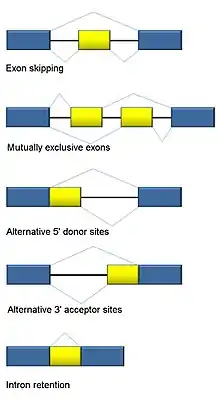 RNA splicing is integral to eukaryotes and contributes significantly to protein regulation and diversity, occurring in >90% of human genes.[117] There are multiple alternative splicing modes: exon skipping (most common splicing mode in humans and higher eukaryotes), mutually exclusive exons, alternative donor or acceptor sites, intron retention (most common splicing mode in plants, fungi, and protozoa), alternative transcription start site (promoter), and alternative polyadenylation.[117] One goal of RNA-Seq is to identify alternative splicing events and test if they differ between conditions. Long-read sequencing captures the full transcript and thus minimizes many of issues in estimating isoform abundance, like ambiguous read mapping. For short-read RNA-Seq, there are multiple methods to detect alternative splicing that can be classified into three main groups:[118][90][119]