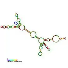 RNase E is a key regulatory enzyme in the pathway of mRNA degradation in Escherichia coli. It is able to auto-regulate the degradation of its own mRNA in response to changes in RNase E activity. This rne 5′ UTR element acts as a sensor of cellular RNase E concentration enabling tight regulation of RNase E concentration and synthesis.[1]