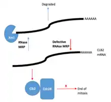 Diagram of RNase MRP role in cell cycle control. Rnase MRP degrades CLB2 mRNA. CLB2 mRNA is processed to create an uncapped RNA transcript. This transcript is then degraded by Xrn1 5'-3' exoribonuclease. Defective RNase MRP results in increased CLB2 mRNA and protein. Maintained CLB2 protein levels allows Cdc28 (a cyclin-dependent kinase) to remain active and inhibit the end of mitosis.
