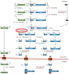 RNase MRP (also called RMRP) is an enzymatically active ribonucleoprotein with two distinct roles in eukaryotes. RNAse MRP stands for RNAse for mitochondrial RNA processing. In mitochondria it plays a direct role in the initiation of mitochondrial DNA replication. In the nucleus it is involved in precursor rRNA processing, where it cleaves the internal transcribed spacer 1 between 18S and 5.8S rRNAs.[1] Despite distinct functions, RNase MRP has been shown to be evolutionarily related to RNase P. Like eukaryotic RNase P, RNase MRP is not catalytically active without associated protein subunits.[2]