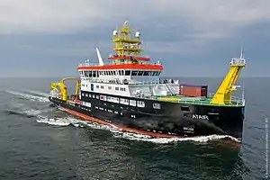 Atair measures 75 metres (246 ft) long, 16.8 metres (55 ft) wide, and has a draft of 5 metres (16 ft).[3] She is powered by three Wärtsilä engines, two of which are LNG-capable, that give her a service speed of up to 13 knots (24 km/h) through a single propeller.[3] Atair is the first research vessel in the world to have an LNG-fueled propulsion system.[1] The crew complement is 18 sailors, with accommodations for up to 15 researchers.[2] Scientific facilities on board include several types of sonar, laboratories, rigging to support the deployment of off-vessel equipment, and deck space to house additional temporary equipment.[2]