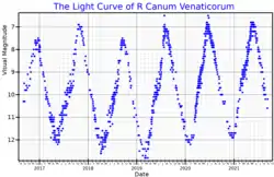 R Canum Venaticorum is a Mira variable star in the constellation Canes Venatici. It ranges between magnitudes 6.5 and 12.9 over a period of approximately 329 days.[3]