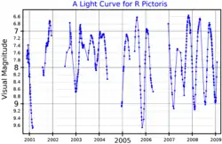 R Pictoris is a semiregular variable type star in the constellation Pictor. It ranges between apparent magnitude 5.1 and 14.4, and spectral types M1IIe to M4IIe, over a period of 168 days.[3]