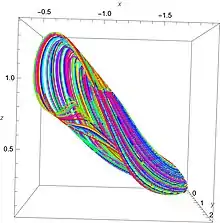 An example of chaotic behaviour is obtained for γ = 0.87 and α = 1.1 with initial conditions of (−1, 0, 0.5),[4] see trajectory on the right. The correlation dimension was found to be 2.19 ± 0.01.[5] The Lyapunov exponents, λ are approximately 0.1981, 0, −0.6581 and the Kaplan–Yorke dimension, DKY ≈ 2.3010[4]