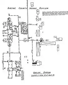 The first insane patients were admitted to the Racine county poorhouse in 1855. The construction of a separate building for the insane was approved by the county board of supervisors on November 26, 1888. The asylum admitted its first three patients on December 18, 1889.[1] By 1904, the hospital housed 133 patients.[2] On February 19 of that year, the building was destroyed in a fire.[3][4] The asylum was rebuilt quickly after the fire, and a home for the county poor was added to the facility in 1918.[5] The institution was also known as the Gatliff Asylum and was served by the Gatliff stop on the railroad.[6][7] Gatliff was named after Nelson Gatliff (1813–1898), an early pioneer in Racine County who owned extensive farmland.[8] The facility was also used as a tuberculosis sanatorium.[9] Later it was known as High Ridge Hospitals[10] and High Ridge Health Care Center of Racine County.[11] It was closed on October 1, 1986, at which time the approximately 210 residents who were there were moved to the new Ridgewood Health Care Center.[12] Asbestos removal in, then demolition of, High Ridge Health Care Center began in October 1988, to be completed by early 1989.[13] The site is now a retail development known as High Ridge Centre, with only the old duck pond remaining from the former asylum.[14]