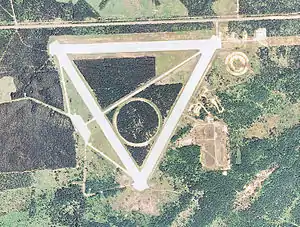 An airfield at Raco was built prior to World War II. Its use was likely to provide air service to the locks at Sault Sainte Marie. It was apparently acquired by the United States Government after the Pearl Harbor Attack and expanded through lease, license, easements and by fee of different tracts of land. A small airfield with three 5,520' x 300' runways was constructed in a triangle pattern. A large number of dispersal points were built in a forested area to the west of the airfield, and a few support buildings were also erected in the woods. After construction, the airfield was designated Raco Auxiliary Airfield, and was designated a Sub-Base of the Air Transport Command Alpena Army Airfield.