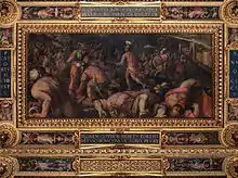 Radagaisus (died 23 August 406) was a Gothic king who led an invasion of Roman Italy in late 405 and the first half of 406.[1][2] A committed Pagan, Radagaisus evidently planned to sacrifice the Senators of the Christian Roman Empire to the gods, and to burn Rome to the ground.[3] Radagaisus was executed after being defeated by the half-Vandal general Stilicho. 12,000 of his higher-status fighters were drafted into the Roman army and some of the remaining followers were dispersed, while so many of the others were sold into slavery that the slave market briefly collapsed. These Goths later joined Alaric I in his conquest of Rome in 410.[4][5][6]