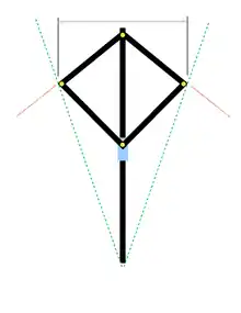 The slider (blue in the adjacent diagram) could move along the central rod, causing the deltoid formed by four other rods to change shape symmetrically. The end points of the rods had sights on them, allowing various sight lines to be defined. The central rod was graduated with various scales. These scales allowed the angles between the end rods (represented by the red lines in the diagram) to be determined as well as the angle with its vertex at one end of the main rod and sides (represented by the green lines in the diagram) through the outer joints of the rods.