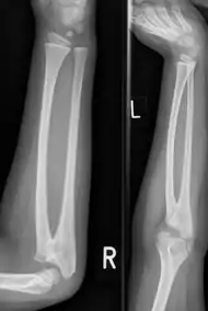 Radioulnar synostosis is a rare condition where there is an abnormal connection between the radius and ulna bones of the forearm.[1] This can be present at birth (congenital), when it is a result of a failure of the bones to form separately, or following an injury (post-traumatic).[2]