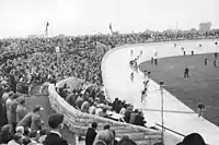 During the time Radrennbahn Weissensee was part of East Berlin, it was also used as a concert venue.[2] Acts such as James Brown and ZZ Top played there, in an attempt to satisfy the musical desires of East German youth.[2] The most known concert held there, and the biggest concert in East German history, was the July 19, 1988, performance of Bruce Springsteen and the E Street Band on their Tunnel of Love Express tour.[1] It attracted officially 160,000 fans (the actual number is said to exceed 200,000) and featured Springsteen introducing Bob Dylan's "Chimes of Freedom" by saying in German, "It's great to be in East Berlin. I want to tell you, I'm not here for or against any government. I came here to play rock-and-roll for you East Berliners in the hope that one day all the barriers will be torn down."[1] It subsequently hosted The Rolling Stones' Urban Jungle Tour in August 1990.