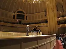 In November 1974, Lupu made his debut with the New York Philharmonic, performing Mozart's Piano Concerto No. 21 (K. 467) conducted by James Conlon.[32][lower-alpha 4][33] In 1975, Lupu debuted with the Concertgebouw Orchestra and gave the premiere of the André Tchaikowsky Piano Concerto, Op. 4 with the Royal Philharmonic Orchestra conducted by Uri Segal at the Royal Festival Hall.[34][35] In 1976, Lupu recorded Brahms' 6 Klavierstücke (Op. 118) and 4 Klavierstücke (Op. 119), which was described by Stereo Review as "a glowing realization of what Brahms set down that leaves one at a loss for words and simply glad to have ears."[11] In 1978, he gave his debut with the Berlin Philharmonic conducted by Herbert von Karajan at that year's Salzburg Festival.[11] Reviewing a recital Lupu gave at Avery Fisher Hall in 1980,[36] Andrew Porter of The New Yorker hailed Lupu as "a master of the most satisfying kind".[11] By 1981 he had played with every major orchestra.[11]