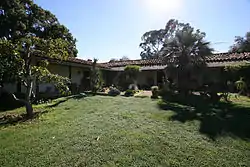 The Gonzalez House is located north of Santa Barbara's central business district, on the south side of Laguna Street between East Canon Perdido Street and East De La Guerra Street. It is a single-story adobe structure, with seven rooms. It is built in the U-shape (with the longest part being parallel to Laguna Street) and stands on a hill, separated from both Laguna and Canon Perdido streets by garden walls. Its walls are up to 2 feet (0.61 m) thick, covered with lime plaster, and its long sides are sheltered by wooden verandas. When built, it had packed-earth floors, which were tiled during restoration in the 1920s. The roof, now shingled, was historically covered in terra cotta tile.[3]