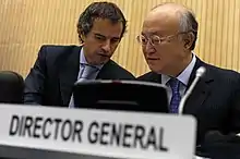 On August 2, 2019, Grossi was presented as the Argentine candidate to become the Director General of IAEA.[12] On 28 October, 2019, the IAEA Board of Governors held its first vote to elect the new Director General, but none of the candidates secure the two-thirds majority in the 35-member IAEA Board of Governors needed to be elected. The next day, 29 October, the second voting round was held, and Grossi won 24 of the 23 needed votes required for Director General Appointment, and became the first Latin American to head the organisation.[13][14] He assumed office on 3 December 2019.[2]