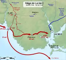 The retreating French forces arrived in Lorient the same evening.[47] Peasants and around 2000 men of the coastguard militias managed to fight guerilla rearguard actions[32] in the countryside separating the British positions from the town.[48] A British reconnaissance force seized Guidel on the first day[49][32] after fighting peasant troops and forcing them to retreat to Quéven.[50]