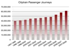 The Brisbane and south east corner of Queensland has experienced significant population growth, with approximately one million more people living in the area over the last 20 years[3] and a forecast population of more than 3.8 million by 2026.[4] This growth has placed an unprecedented demand on public transport and its infrastructure; Citytrain has reported successive patronage increases of 9% in both the 2005–2006[5] and 2006–2007[6] financial years, and a 6.6% increase in the 2007–2008 financial year.[7]