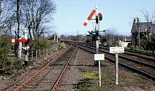 During the 1870s, all the British railway companies standardised on the use of semaphore signals, which were then invariably all of the lower quadrant type.[3] From the 1920s onwards, upper quadrant semaphores almost totally supplanted lower quadrant signals in Great Britain, except on former GWR lines.[4] The advantage of the upper quadrant signal is that should the signal wire break, or the signal arm be weighed down by snow (for instance), gravity will tend to cause the signal to drop to the safe "danger" position. In a lower quadrant signal, the opposite may happen, sending the signal to "off" when in fact it should be illustrating "danger". Their spectacle cases, which are on the opposite side of the spindle on which the signal arm is pivoted, are therefore required to be sufficiently heavy to prevent this happening.[5]