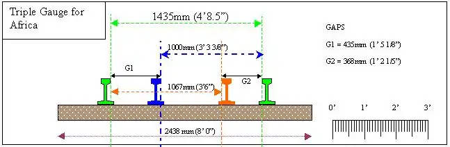 1,000 mm (3 ft 3+3⁄8 in) and 1,067 mm (3 ft 6 in) are too close to allow 3-rail dual gauge; you have to have 4-rail dual gauge. But if you have 4-rail gauge, then you can include 1,435 mm (4 ft 8+1⁄2 in) gauge (standard gauge) at the cost of slightly longer sleepers.
