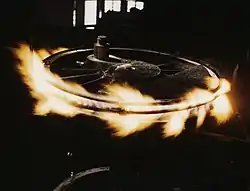 The tire is fitted by heating to a controlled temperature, avoiding overheating. This causes the tire to expand. The wheel centre, usually already mounted on the axle, is lowered into the tire which is flange side up. The tire cools, and the retaining ring (a shaped steel bar rolled into a hoop) is fitted into the groove. Hydraulically operated rolls swage the groove down on to the retaining ring.