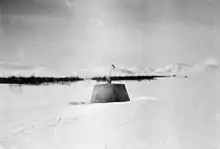 Raising the Flag on the Three-Country Cairn[Note 1] is a historic photograph taken on 27 April 1945, which was the last day of the Second World War in Finland. It depicts a Finnish Army patrol of Battle Group Loimu, Infantry Regiment 1 (Finnish: taisteluosasto Loimu, jalkaväkirykmentti 1), raising the Finnish flag on the three-country cairn between Norway, Sweden, and Finland to celebrate the last German troops withdrawing from Finland. The photograph was taken by the commander of Infantry Regiment 1, Colonel Väinö Oinonen (alternatively V.J. Oinonen). It became a widely circulated symbol of the end of World War II in Finland.