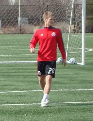 In March 2010 Hščanovičs went on trial with the Canadian club Toronto FC and signed a two-year contract with them in the beginning of April, therefore, becoming the first ever Latvian player to play in the Major League Soccer.[3] He made his debut for the club in an away loss to New England Revolution on 10 April 2010. Varying between the first eleven and subs Hščanovičš made 14 MLS appearances for Toronto and helped them win the Canadian Championship for the second year in a row.[4] He also participated in the CONCACAF Champions League, playing three matches. After the end of the season, on 24 November, Hščanovičš was released.[5]