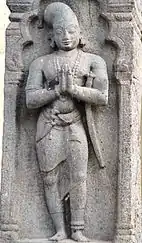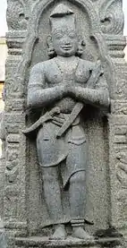 The originally temple was first constructed by Kulothunga Chola I(1070-1125 A.D.) stone inscription found in the site.[6] The place Mannargudi is termed Sri Rajathi Raja Chathurvedhi Mangalam[7] and the town started to grow around the temple. Successive kings of the Chola empire, Rajaraja Chola III, Rajendra Chola III and kings of Thanjavur Nayaks, Achyuta Deva Raya[8] expanded the temple. The temple contains inscriptions of the Hoysala kings and some Vijayanagara grants, and many records of the later Nayaks and Marathas.[9] The Thanjavur Nayaks made the temple as their dynastic and primary shrine and made significant additions.[10] The current temple structure, hall of 1000 pillars, main gopuram (temple gateway tower) and the big compound wall around the temple was built by the king Vijayaraghava Nayak(1532-1575 A.D.).[6] Raghunathabhyudayam, a doctrine by Nayaks explains the donation of an armour studded with precious stones to the main deity by the king.[8] He erected the big tower in the temple so that he can view the Srirangam Ranganathaswamy temple from the top of Mannargudi. The Nayaks were specially interested in music and it was promoted in both the temples. Instruments like Mukhavina, Dande, Kombu, Chandravalaya, Bheri and Nadhaswaram were commonly used in the temple service.[11]