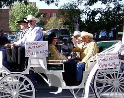 On August 20, shortly after the film crew incident and documentary, Klein uncharacteristically appeared at the morning CFCN news meeting and announced he would run for Mayor against Alger.[36] Klein's campaign started on rocky footing, he had little funds and limited knowledge of how to run a campaign or organize volunteers. He hired his friend Webster MacDonald, a lawyer, and labour organizer Ted Takacs to run co-manage his campaign, but neither was particularly adept. Finally he convened a group of 20 of his friends to discuss moving to the Alderman ticket, and after convincing Klein to continue to run for Mayor, they formed what became known as the "Klein Gang" a group of diehard supports which remained with him throughout his political career.[39] Shortly afterwards he opened his campaign office in a small space donated by local businessman Jack Singer and his campaign began to take off. It was in this office he first met Rod Love, a recent University of Calgary political science dropout.[40] Love had initially offered to work for Alger's campaign, but was not offered a position he was interested in.[41] The Klein campaign continued to grow, although remained strained financially, with Klein only raising a total of $22,000.[40] In the week before the election Klein's public position improved as many estimated he was neck and neck with Alger, and ahead of the third candidate, Alderman Peter Petrasuk.[42] Alger the incumbent had accumulated $150,000 for the election, had strong support in the Chamber of Commerce, and a clean name.[43] His other opponent, Petrasuk was a prominent lawyer with a large ethnic voter base and significant fundraising capabilities.[43] Klein sought an endorsement from former Mayor Sykes who still held considerable sway amongst voters, Sykes declined as he had previously promised the other candidates he would not endorse any candidate, but agreed to an interview which he would say that Klein stood a chance in the election.[44][29] The final mayoral debate took place 36 hours before the polls opened, with Alger and Petrasuk battling over rising budgets while Klein ignored the topics and spoke of accountability, open government and making Calgarians proud of the city.[45][46]