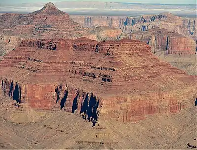 | Type of rock | Hermit Shale-(prominence-debris) Supai Group-(unit 4, platform-Esplanade Sandstone), Supai Group, Redwall Limestone, Tonto Group-(3 units), 3_Muav Limestone, 2_Bright Angel Shale, 1_Tapeats Sandstone, Grand Canyon Supergroup-(4 units), 1-Unkar Group-(5-units), (unit 5)-Cardenas Basalt, (unit 4)-Dox Formation |