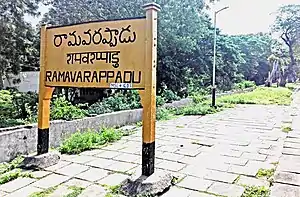 Ramavarappadu railway station is an Indian Railway station in Vijayawada of Andhra Pradesh.[1][2] It is situated on Vijayawada–Nidadavolu loop line of Howrah–Chennai main line and is administered by Vijayawada railway division of South Coast Railway zone.[3] It is categorized as a Non-Suburban Grade-6 (NSG-6) station in the division.[4] It is an important station alongside Ramavarappadu, for devotees during the annual Mary Matha festival, celebrated at Gunadala hill shrine in the city.[5]