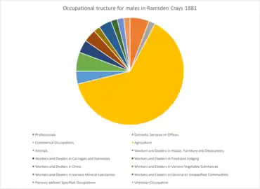 The earliest known record of occupation in Ramsden Crays was in 1831, it listed males over the age of 20 in 9 different occupation categories. Similar to the occupational structure of 1881, agriculture was the dominant employer with 47 of the 75 listed working in agriculture, predominately as labourers. 17 men worked in retail and handicraft, this field was most likely split into more clear-cut roles for the 1881 census and beyond. Nearly every other role were occupied by 1–2 men. Some roles not occupied by men may have been occupied by women who were not recorded at the time of recording.[7]