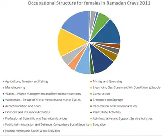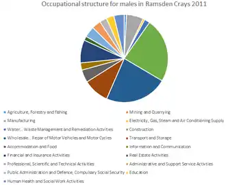 The occupational structure for men and women in Ramsden Crays in 1881 illustrates that for men, agriculture was the dominant employer. Agriculture made up nearly2/3 of employment with 33, of these 24 were working as farm labourers. The remaining male occupations in Ramsden Crays like gamekeeper, carpenter and blacksmith were occupied by 1–2 people maximum, highlighting the dominance of agriculture in the parish. The female occupational structure was dominated by women who did not work or did not have a listed occupation, making up more than half of women. Women were also excluded from many occupations such as agriculture, commercial and vegetable substance services. In contrast, educational and dress making occupations were only occupied by women.[8]