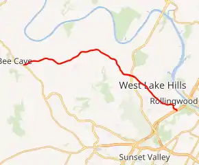 Ranch to Market Road 2244 (RM 2244) is an 11.3-mile (18.2 km) state-maintained roadway located in Travis County, Texas.[1] It is simply called 2244 for short as well as Bee Cave Road or Bee Caves Road. Whether the name of the road is Bee Cave (singular) or Bee Caves (plural) is a matter of some confusion even among locals (road signs vary), but the prevailing view is that Bee Caves Road leads to the town of Bee Cave, Texas, and at least one local newspaper has settled on the plural name for the road.[2] (This confusion is not recent: The post office for the town of Bee Cave opened there under the name Bee Caves in 1870.) [3]