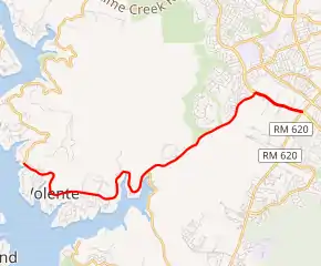 RM 2769 begins in Volente at an intersection with Lime Creek Road.[2] It proceeds northeast to an intersection with Anderson Mill Road, along which it continues for one mile (1.6 km) before terminating at RM 620 near the Travis–Williamson county line.[3][4]