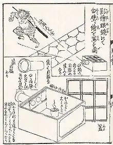 The mechanism of a magic lantern, called "shadow picture glasses" (影絵眼鏡, Kagee Gankyō) was described using technical drawings in the book titled Tengu-tsū (天狗通) in 1779.