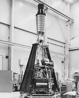 Ranger 2 was of the Ranger Block 1 design and was almost identical to Ranger 1. The spacecraft consisted of a hexagonal base 1.5 metres (4 ft 11 in) across, upon which was mounted a cone-shaped 4-meter-high (13.1 ft) tower of aluminum struts and braces. Two solar panel wings measuring 5.2 metres (17 ft) from tip to tip extended from the base. A high-gain directional dish antenna was attached to the bottom of the base. Spacecraft experiments and other equipment were mounted on the base and tower. Instruments aboard the spacecraft included a Lyman-alpha telescope, a rubidium-vapor magnetometer, electrostatic analyzers, medium-energy-range particle detectors, two triple coincidence telescopes, a cosmic-ray integrating ionization chamber, cosmic dust detectors, and scintillation counters.[1]