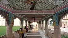 In the complex of Rani Sati temple there is also the Lord Hanuman Temple, Sita Temple, Thakur Ji temple, Lord Ganesha Temple and Shiva Temple. A regular 'Prasad' distribution takes place after every 'aarti'.[3] As well as the main temple there are twelve smaller sati temples.[4] A huge statue of Lord Shiva is located in the centre of the complex and is surrounded by green gardens.[5] Inside the temple, the interiors are adorned with exquisite murals and glass mosaics depicting the entire history of the place.