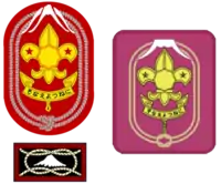 The rank program uses a series of medals and patches as emblems. The left-pocket badge oval shape and coloration is based on the rank badges used by the Boy Scouts of America between 1972 and 1990. The badge for the Apprentice or Scout rank consists of a simple fleur-de-lis, which symbolizes a compass needle. The needle points the Scout in the right direction, onward and upward.[4] This is the only badge to have a button loop, to emphasize its temporary status and that a Scout should soon move on to Tenderfoot. The next two ranks show the rank highlighted with the rest of the emblem subdued into the background. The Tenderfoot badge takes the fleur-de-lis of the Scout badge and incorporates the sacred mirror Yata no Kagami, which represents wisdom and honesty. The stars symbolize truth and knowledge. The Second Class badge features a scroll inscribed with the Scout Motto, with the ends turned up and a knotted rope hanging from the bottom. The knot reminds each Scout to remember the Scout slogan, Do a Good Turn Daily, and the upturned ends of the scroll symbolize cheerfulness in service.[5] The First Class badge combines the elements of the Tenderfoot and Second Class badges. The First Class badge is essentially the same as the emblem of the SAJ. Chrysanthemum has a First Class symbol on a stylized white chrysanthemum, the symbol of the Japanese Royal Family. Fuji Scout was originally the ultimate rank at the Scout level, and thus of Japanese Scouting itself, prior to the creation of Venture Scouting. Now it is the highest level in Venturing, still the highest youth rank overall.[6]